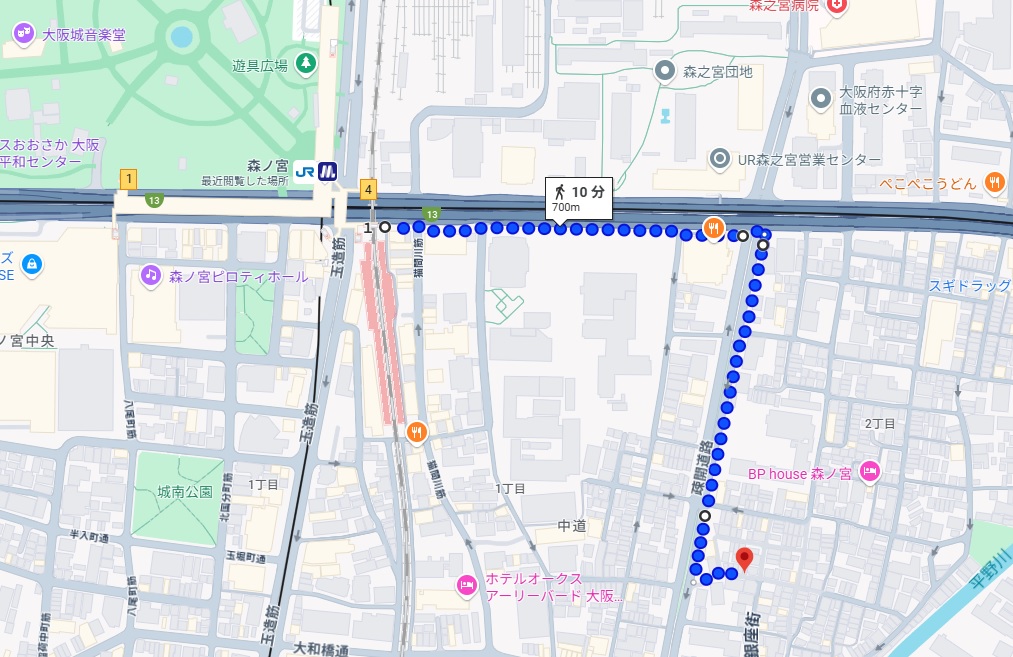 JR森ノ宮駅北口改札を出て直進し、大通りに出たら右折。